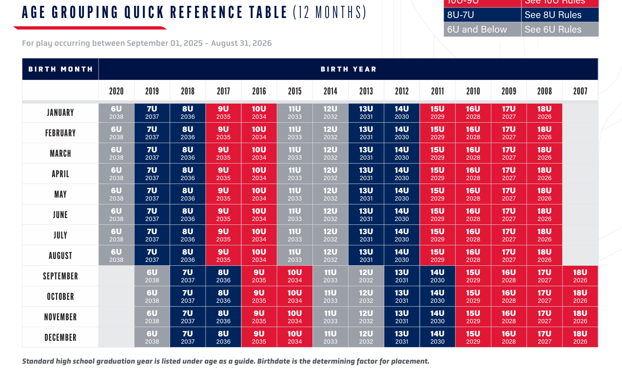 Please choose the program your player is eligible to play when registering for summer camps/leagues, find his/her birth date in the date ranges below.