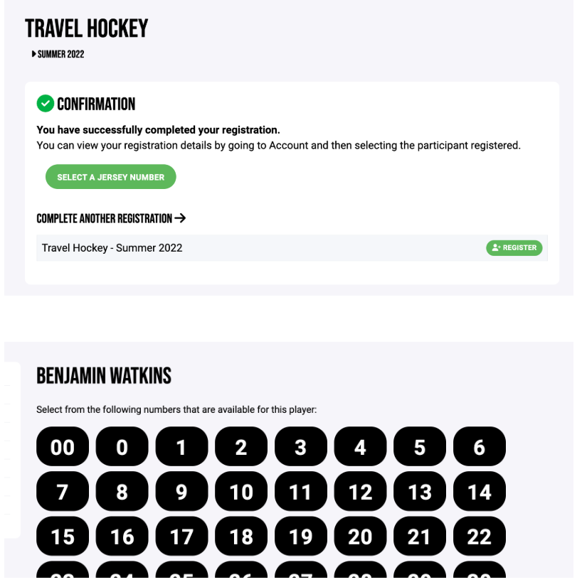 Jersey Numbers - WULAX has now enabled the Jersey Management function on Crossbar. Once registration is completed, and on the confirmation (which is the last step of the registration) you see a link to select a number for your athlete. Numbers will be assigned on a first come-first served basis. Once a number is selected for the age group, it will no longer be available. This means that the earlier you register your athlete the better chance you will have to get their number. An example of the confirmation is to the right: